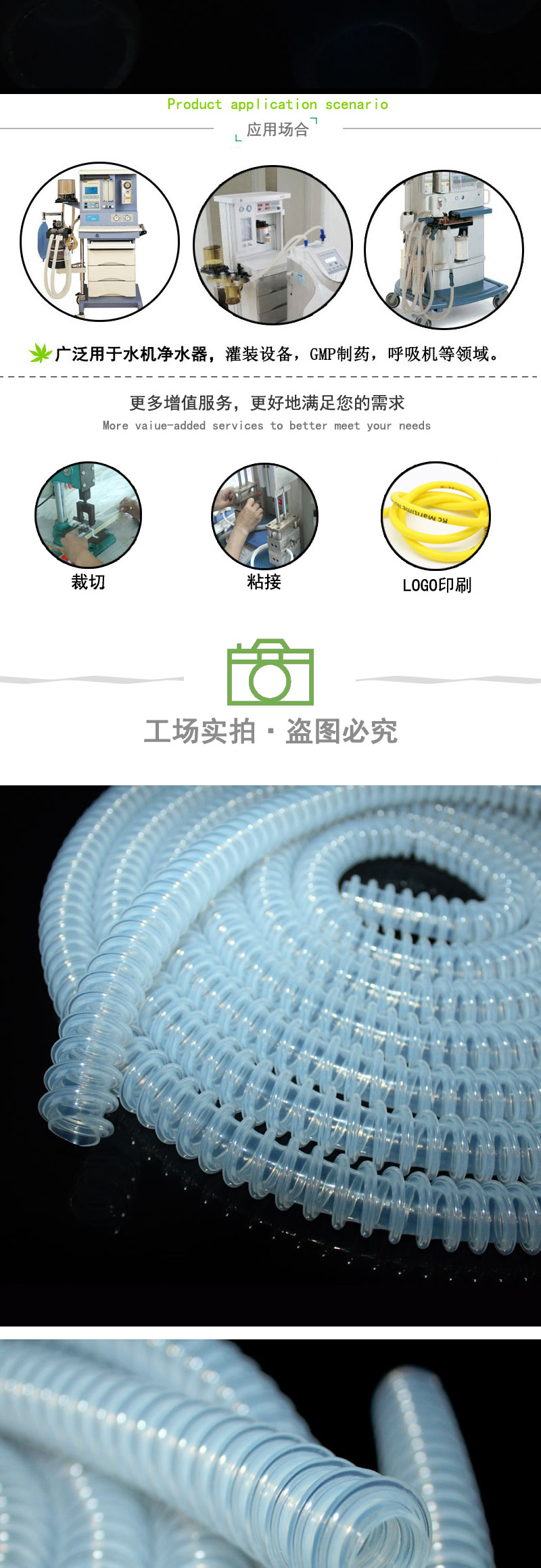 高透硅膠波紋管:采用進(jìn)口硅膠原材料,連續(xù)擠出一次成型,內(nèi)壁平滑;常規(guī)硬度60度(邵氏硬度30-90度);耐溫范圍廣(-50~+280℃),可以適應(yīng)高、低溫設(shè)備需求,并耐老化。常規(guī)PE袋+紙箱包裝,特殊要求可按客戶標(biāo)準(zhǔn);產(chǎn)品符合SGS、FDA、LFGB、生物相溶性等;用于呼吸機(jī)、麻醉機(jī)、制氧機(jī)、輸氧機(jī)管道等。