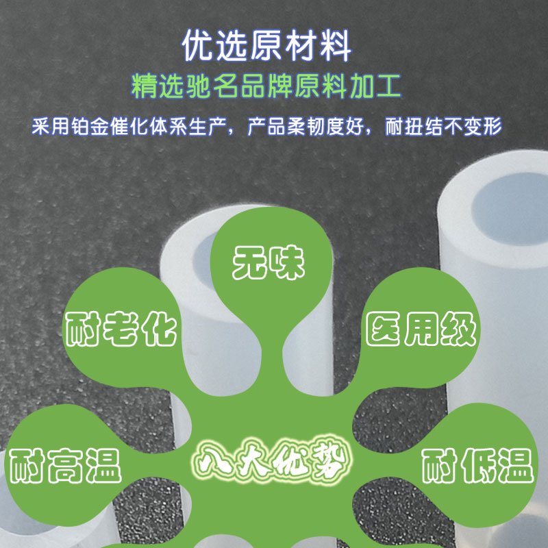 鉑金氣腹機(jī)硅膠管:采用進(jìn)口硅膠原材料,連續(xù)擠出一次成型,內(nèi)壁平滑;常規(guī)硬度60度(邵氏硬度30-90度);耐溫范圍廣(-50~+280℃),可以適應(yīng)高、低溫設(shè)備需求,并耐老化。常規(guī)PE袋+紙箱包裝,特殊要求可按客戶(hù)標(biāo)準(zhǔn);產(chǎn)品符合SGS、FDA、LFGB、生物相溶性等;用于呼吸機(jī)、麻醉機(jī)、制氧機(jī)、輸氧機(jī)管道等。