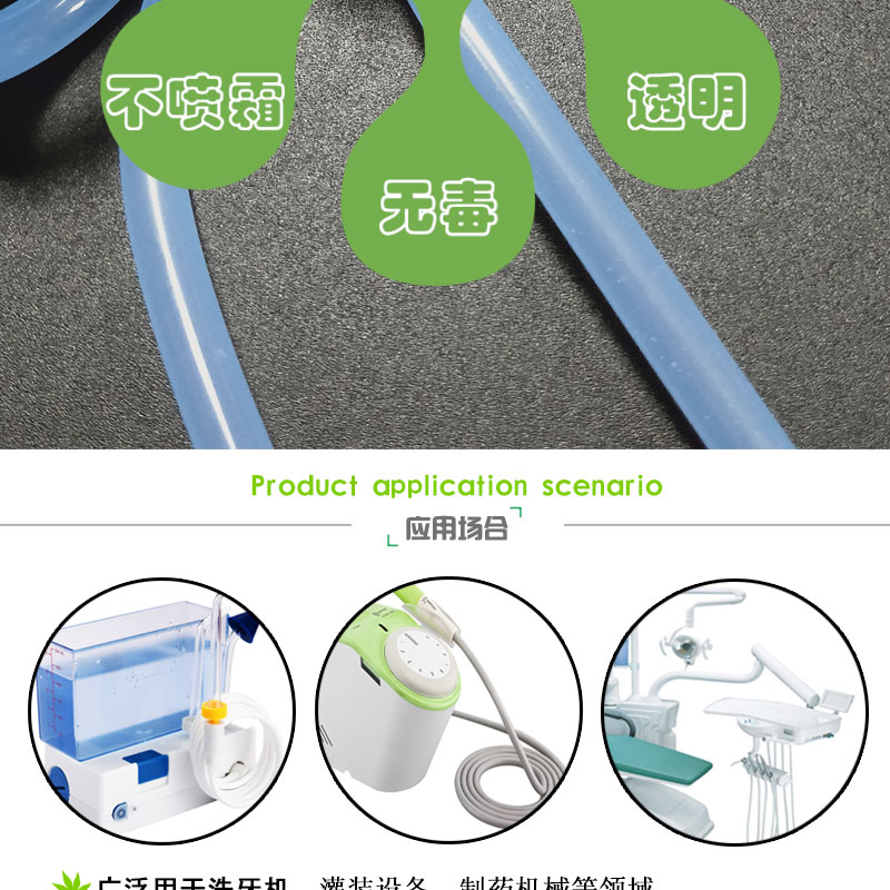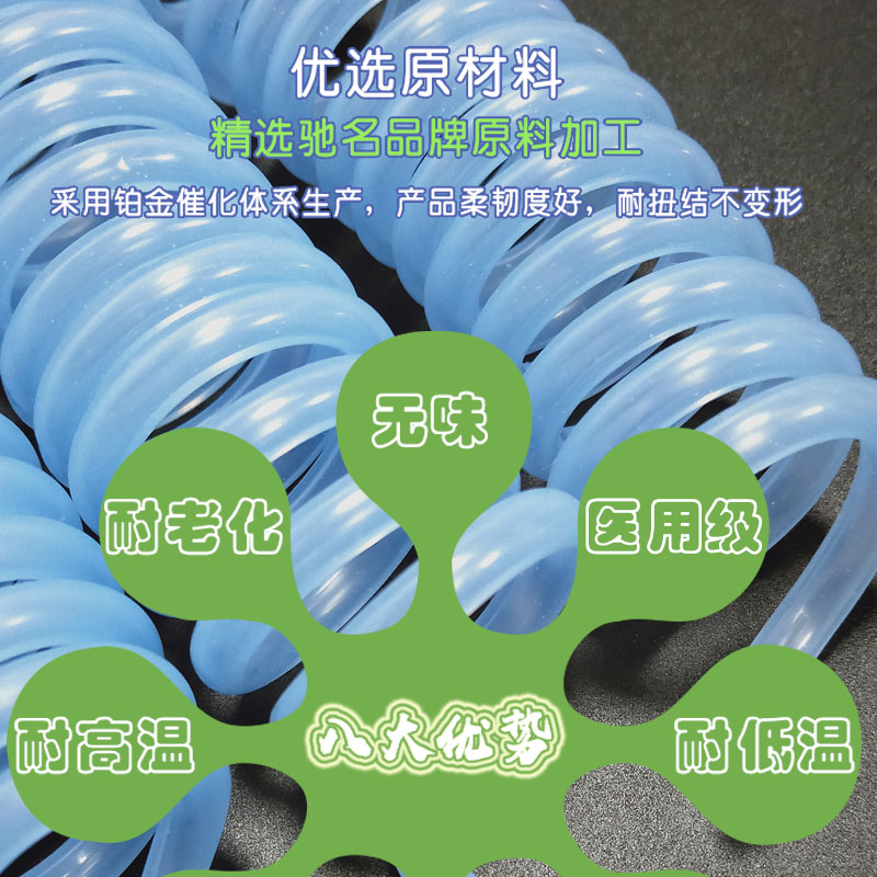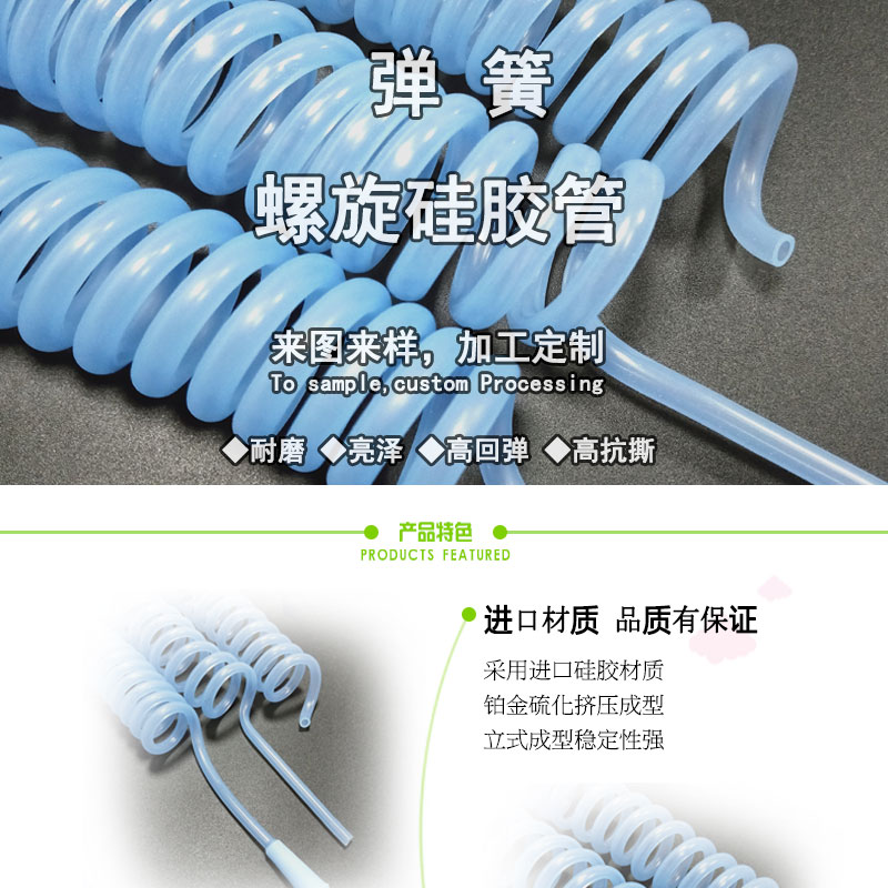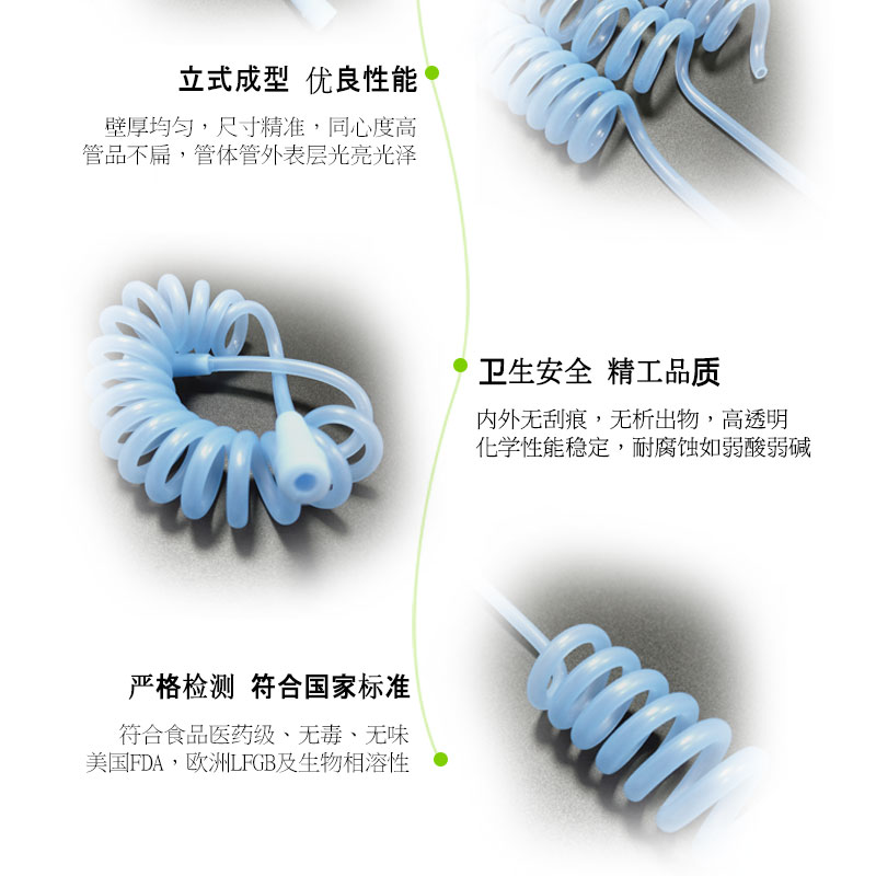 彈簧拉伸式硅膠管: 采用特種硅膠原材料,連續(xù)擠出成型,內壁平滑;常規(guī)硬度70度(邵氏硬度30-80度);耐溫范圍廣(-50~+280℃),可以適應高低溫設備需求,并耐老化。常規(guī)PE袋+紙箱包裝,特殊要求可按客戶標準;產品符合SGS、FDA、LFGB、生物相溶性等;用于醫(yī)療激光洗牙機,醫(yī)用設備、呼吸傳送等設備。