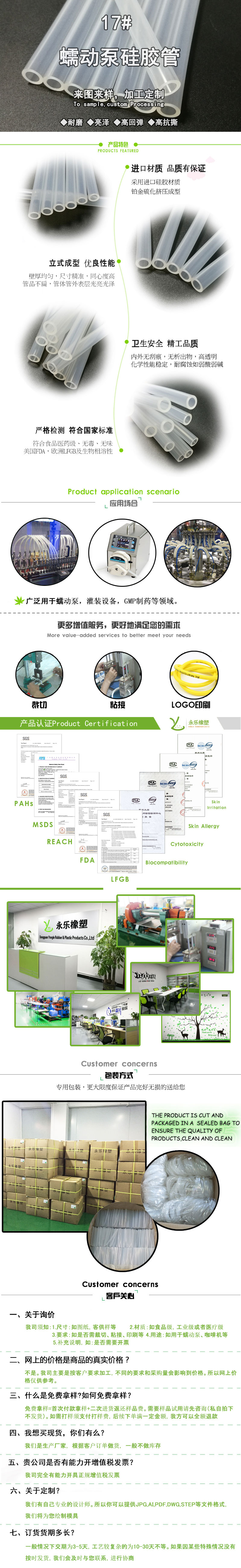 19#蠕動泵硅膠管:采用進口硅膠原材料,連續(xù)擠出一次成型,內(nèi)壁平滑;常規(guī)硬度60度(邵氏硬度值30-90度);耐溫范圍廣(-50~+280℃),可以適應(yīng)高、低溫設(shè)備需求,并耐老化。常規(guī)PE袋+紙箱包裝,特殊要求可按客戶標(biāo)準(zhǔn);產(chǎn)品符合SGS、FDA、LFGB、生物相溶性等;用于灌裝機、蠕動泵專用、醫(yī)療醫(yī)用器械、輸液泵等。