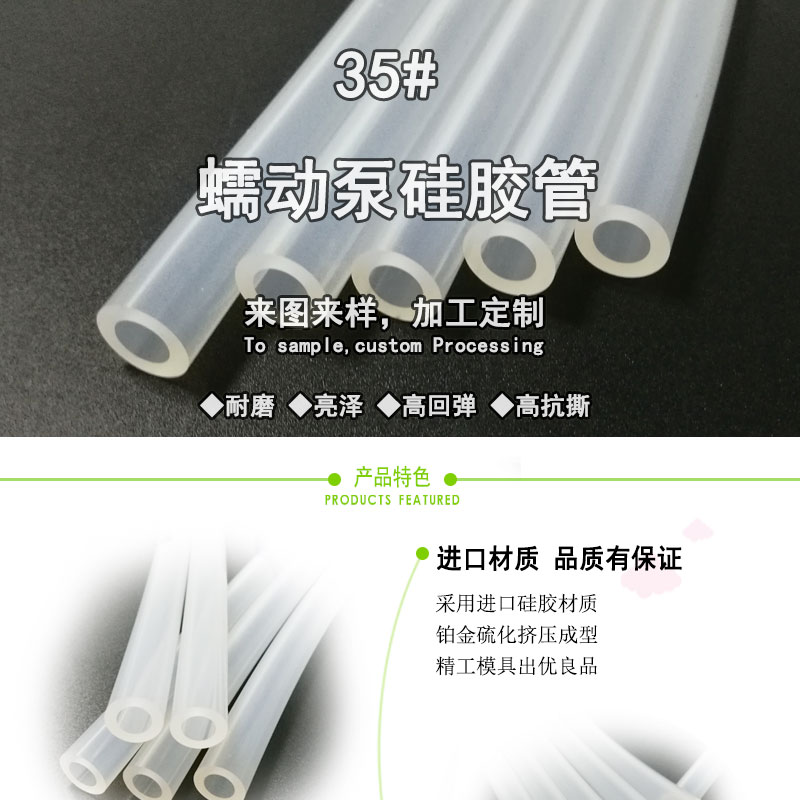 35#蠕動(dòng)泵硅膠管:采用進(jìn)口硅膠原材料,連續(xù)擠出一次成型,內(nèi)壁平滑;常規(guī)硬度60度(邵氏硬度值30-90度);耐溫范圍廣(-50~+280℃),可以適應(yīng)高、低溫設(shè)備需求,并耐老化。常規(guī)PE袋+紙箱包裝,特殊要求可按客戶標(biāo)準(zhǔn);產(chǎn)品符合SGS、FDA、LFGB、生物相溶性等;用于灌裝機(jī)、蠕動(dòng)泵專用、醫(yī)療醫(yī)用器械、輸液泵等。