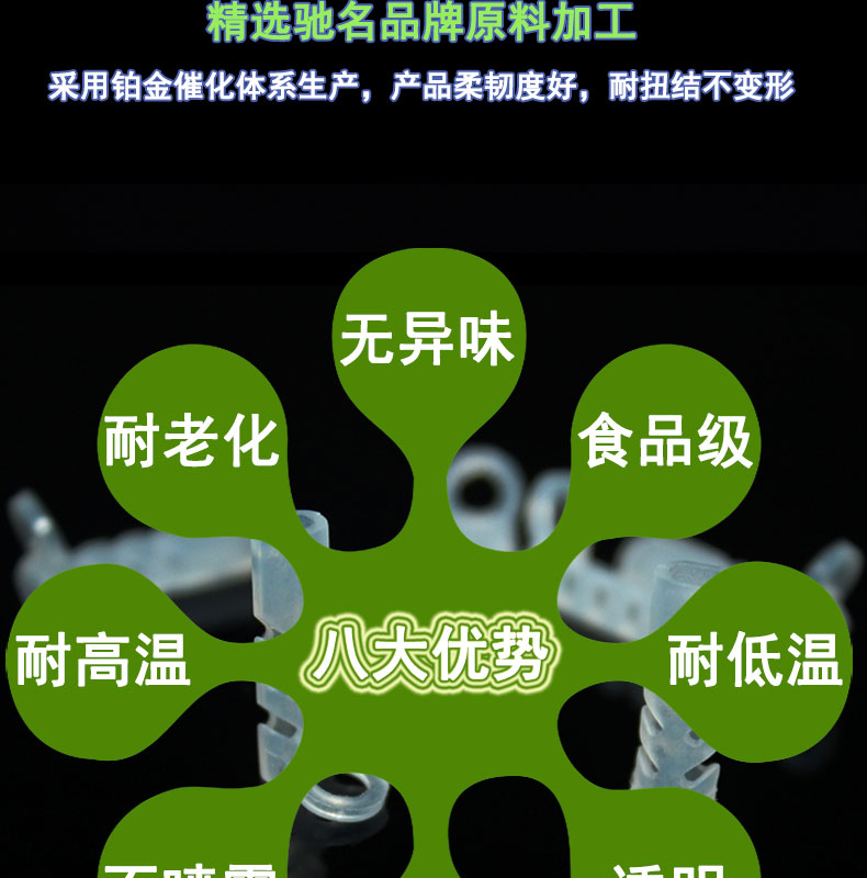 醫(yī)療器械用模壓硅膠配件采用進(jìn)口硅膠材料,模壓成型,內(nèi)壁平滑,壁厚均勻;常規(guī)60度(邵氏硬度值20-80度);耐溫范圍廣(-50~+280℃),可以適應(yīng)高、低溫設(shè)備需求,并耐老化。常規(guī)PE袋+紙箱包裝,特殊要求可按客戶標(biāo)準(zhǔn);產(chǎn)品符合SGS、FDA、LFGB、生物相溶性等;用于灌裝機(jī)、蠕動(dòng)泵專用、醫(yī)療醫(yī)用器械、輸液泵等。